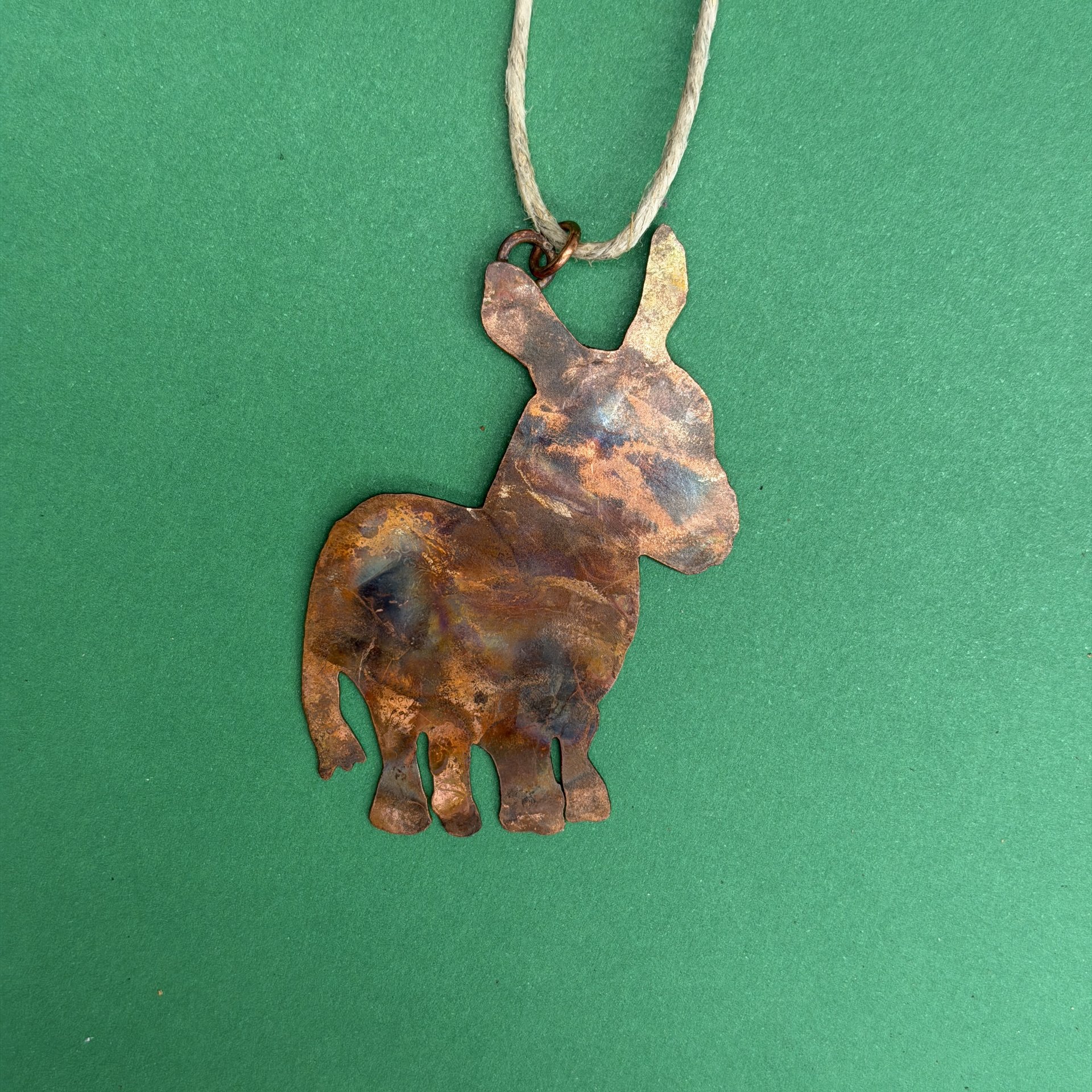 Copper ornament, this one a simple little donkey silhouette made in copper with a flame patina. Patina coloring can/will vary from photos as each one is uniquely made one at a time.